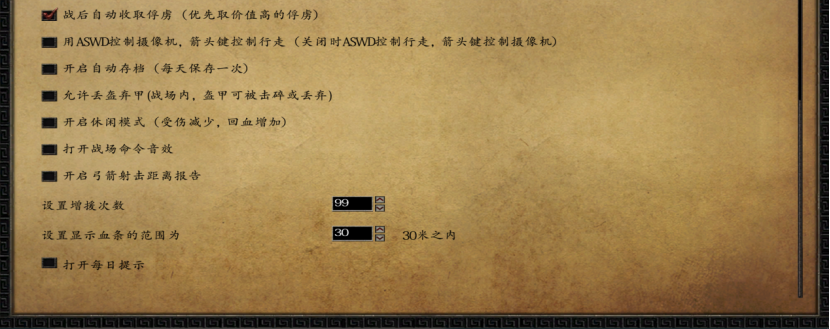 F8 MOD设置界面可以根据自己的喜好,精细化定制本MOD。比如,玩家的血条显示位置,自立时的国家颜色,野外战场的大小,野外战场上的初始阵型,战后是否自动收集箭矢到辎重车,战斗中是否允许NPC使用辎重车进行补给,击杀图标是否开启,击杀功勋是否显示,骑兵是否开启迂回AI,骑射AI是否开启,战后是否自动收取俘虏等等。